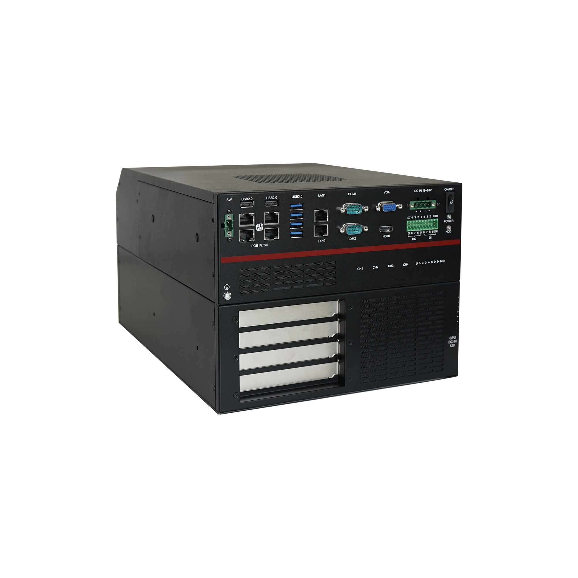 | 可選擴展接口 ( 兩槽擴展卡) Optional (2 slot expansion card) | 1 x Mini-PCIe with USB2.0 signal 1 x M.2 3042/3052 Key-B, Co-lay with USB3.1 G2&PCIe signal 1 x PCIe X16 (GPU card Max size :336x146mm ) 2 x PCIe X4 1 x PCI 1 x SIM card for 3G/4G module 1 x SIM card slot for 5G module |
